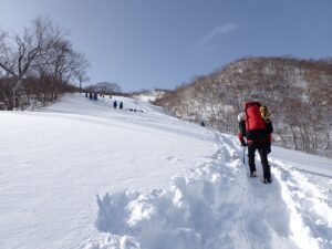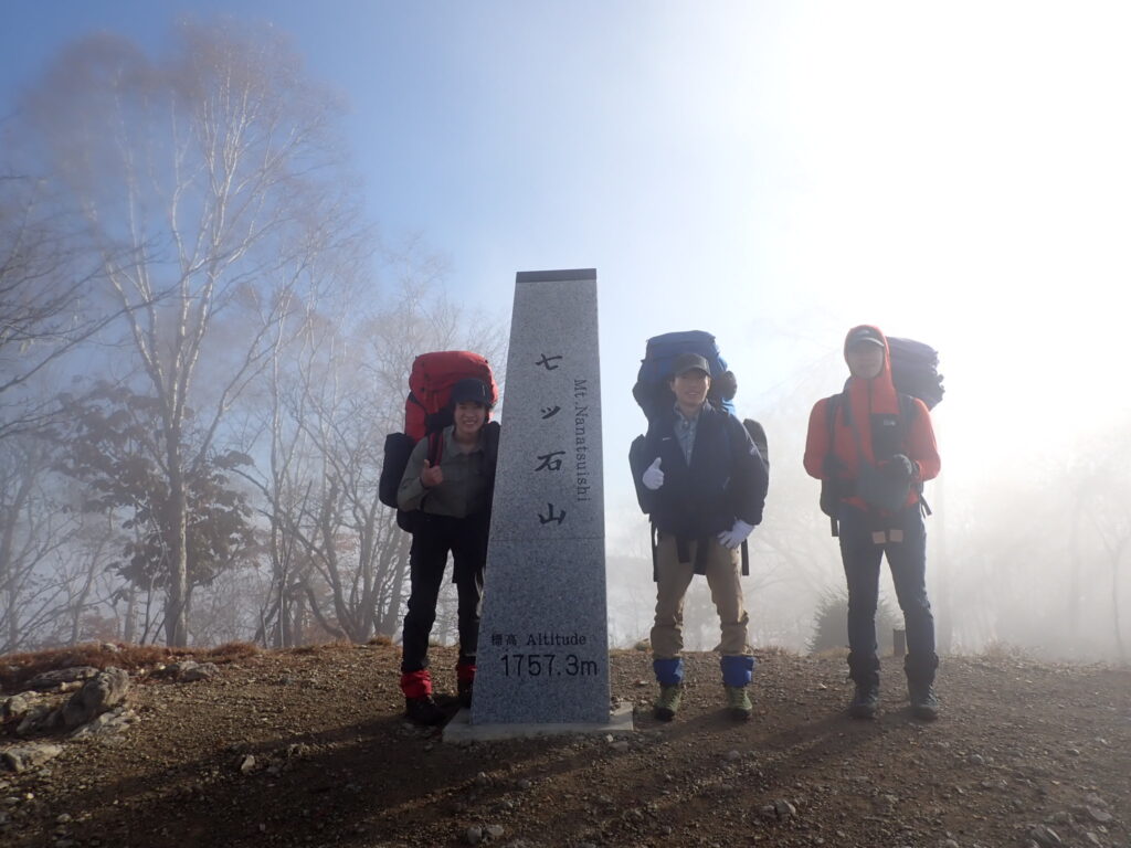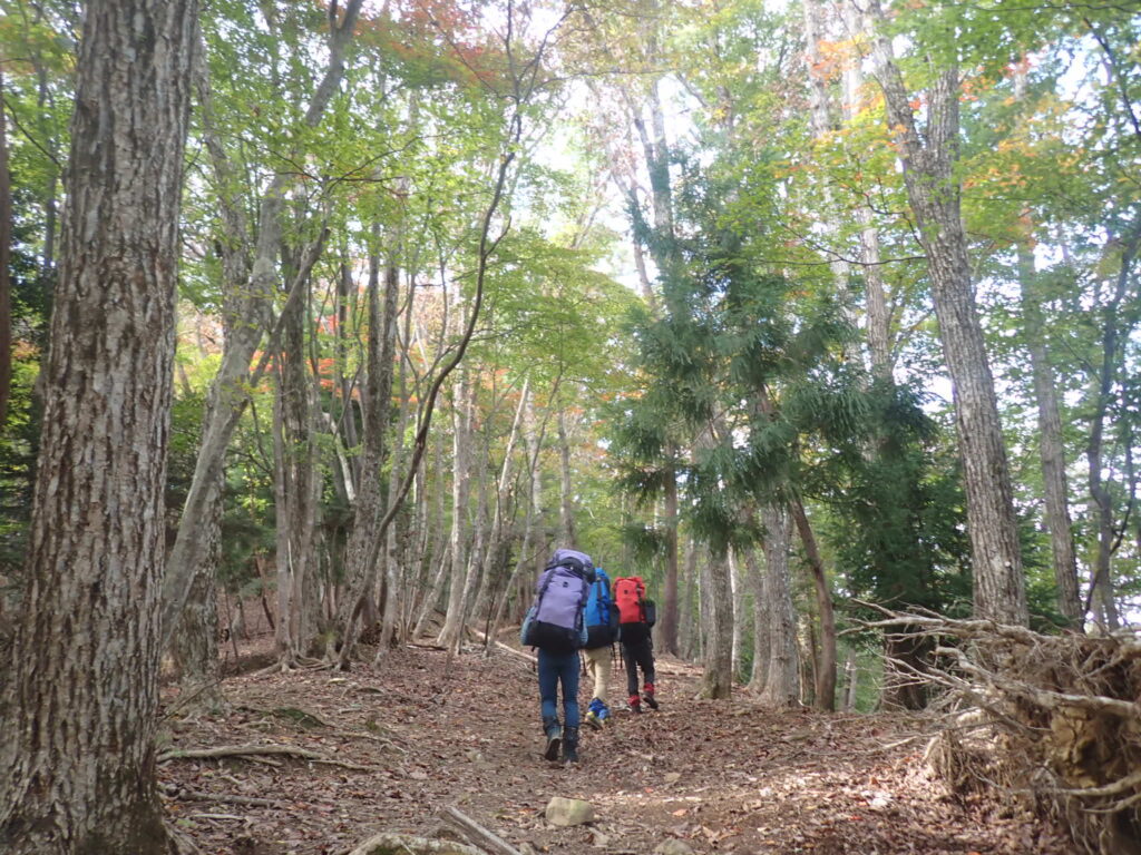 そこから急登が続くが、しばらくして鈴木が軽い腰痛を訴えたためゆっくりとしたペースで進む。六ツ石山との分岐で休憩する。その後は平坦なトラバース道が続く。