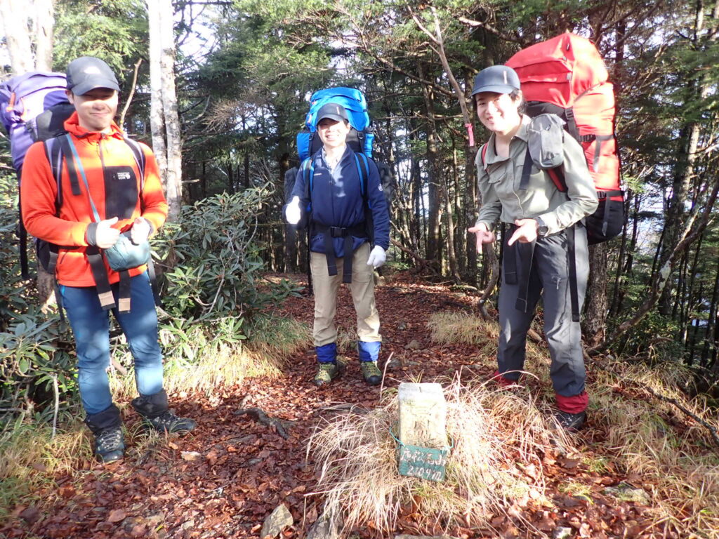 1830m 付近のコルで下級生 2 人の官物を上級生 2 人が持つ。