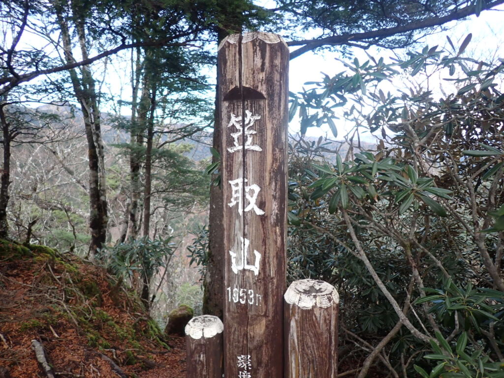 2000m 付近から笹藪がひどくなり滑りやすくなっている。水干尾根との分岐点から稜線上に上がり笠取山山頂に到着する。休憩をして写真撮影をする。晴れていてとても気持ちが良い。