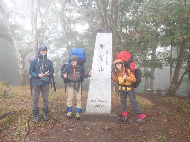 10月4日、武蔵五日市駅から小沢バス停へ向かい登山を開始。伊勢清峯神社を経て湯久保山に登頂し、休憩後御前山へ向かう。途中で小雨となり雨具を着用し、御前山到着後に避難小屋へ下る。避難小屋到着後、関が発熱したため休養させる。