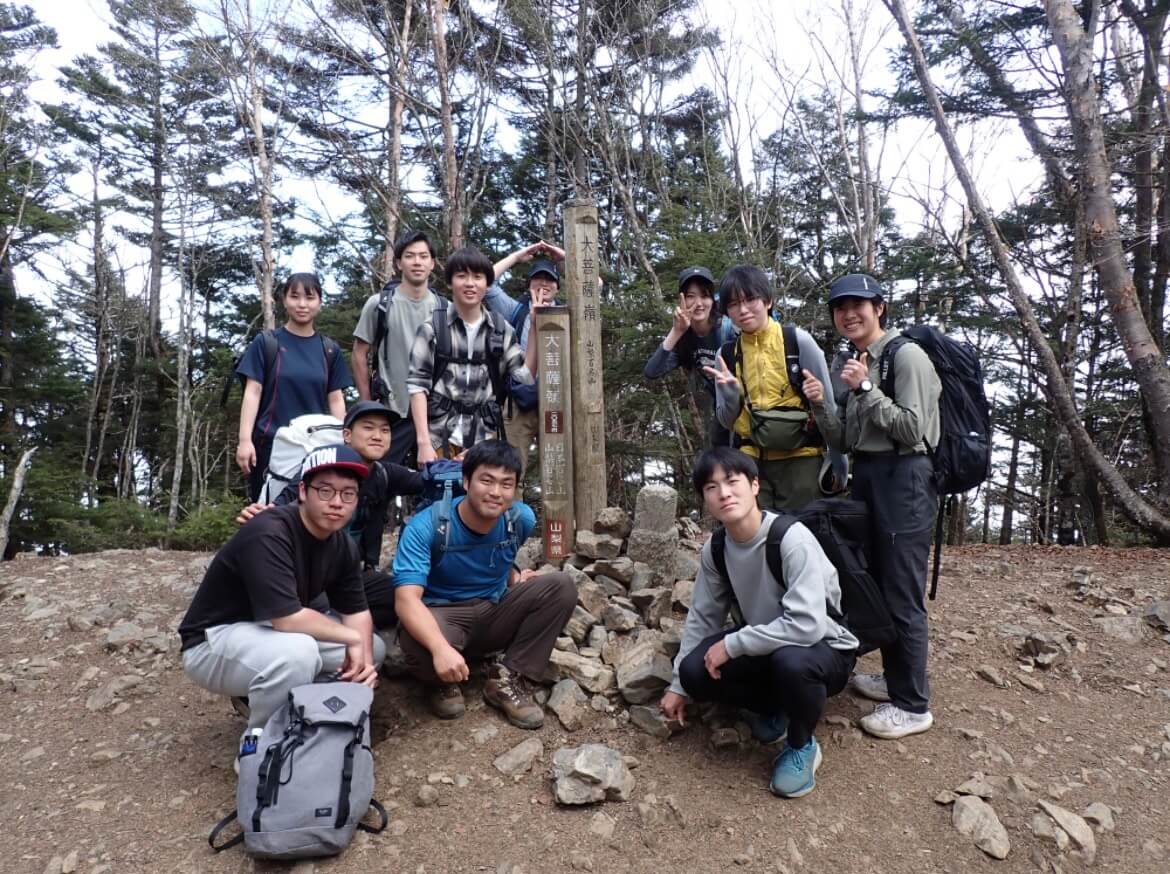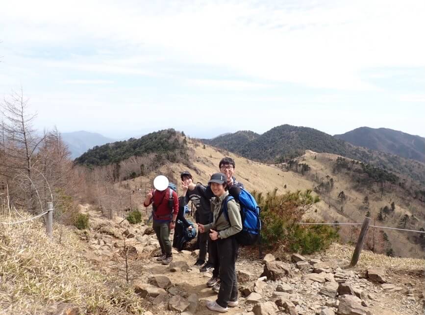 1年生の様子を確認しながら適宜休憩を挟み、比較的緩やかな登りを進む。大菩薩嶺に到着後、山頂にて写真撮影を行う。その後開けた場所まで移動し長めの休憩をとる。