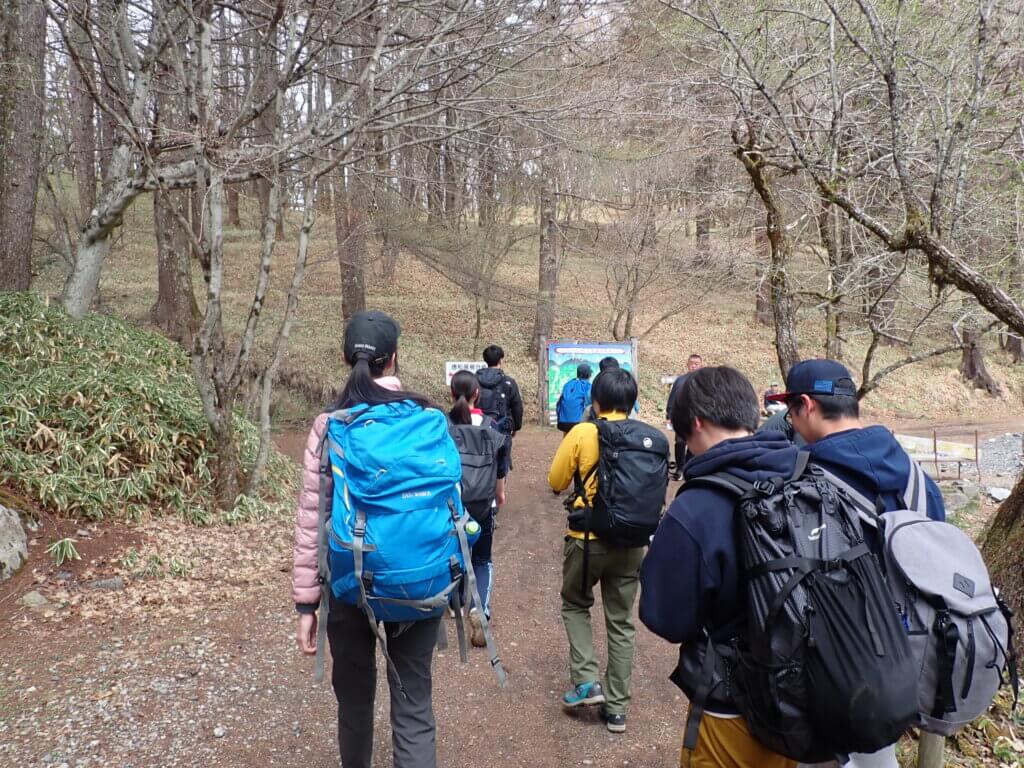 上日川峠バス停到着後、全員で準備体操を行い出発する。