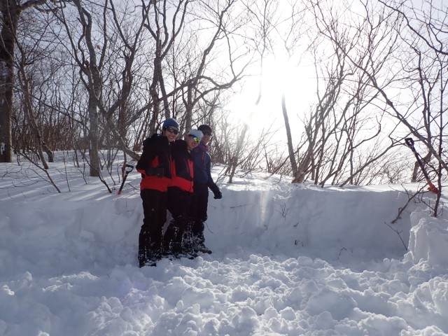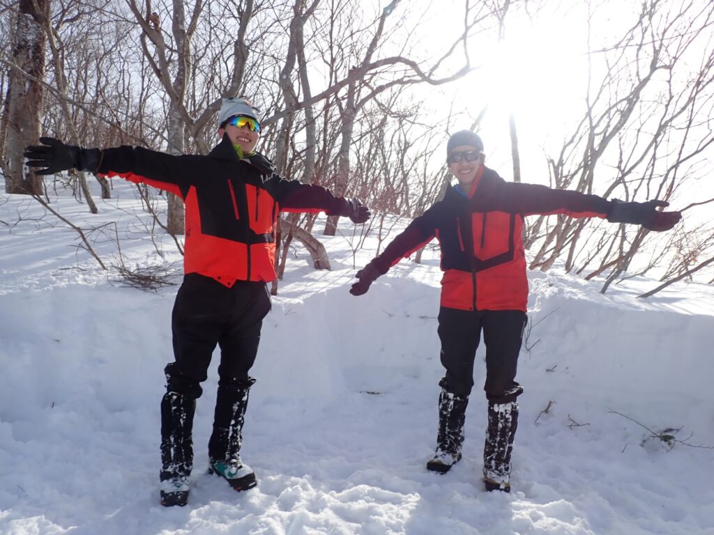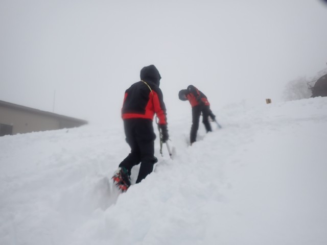 天神平に到着した後、雪上訓練を行う。川嶋、鈴木でピッケルワーク・カッティングを行った後、ツボ足でキックステップでのダイアモンド歩行を行う。