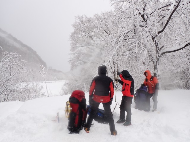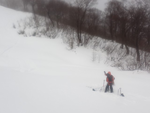 降雪の勢いは変わらないが、登山口付近の安全な場所で予定通り雪上訓練を行うこととする。管野、鈴木でスタカットの訓練を行う。