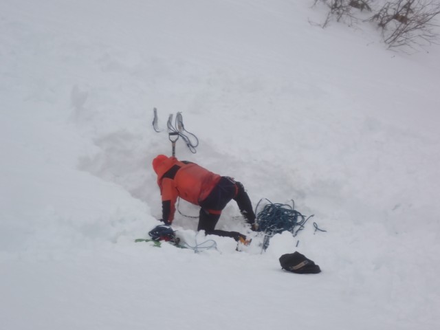 その後、全員でアンカー構築の注意点や方法を確認する。スノーバーの縦埋めや横埋め、Fixバー、スタッフバックの利用など様々なアンカーの構築方法を実践し、どの程度の強度があるのか確認する。